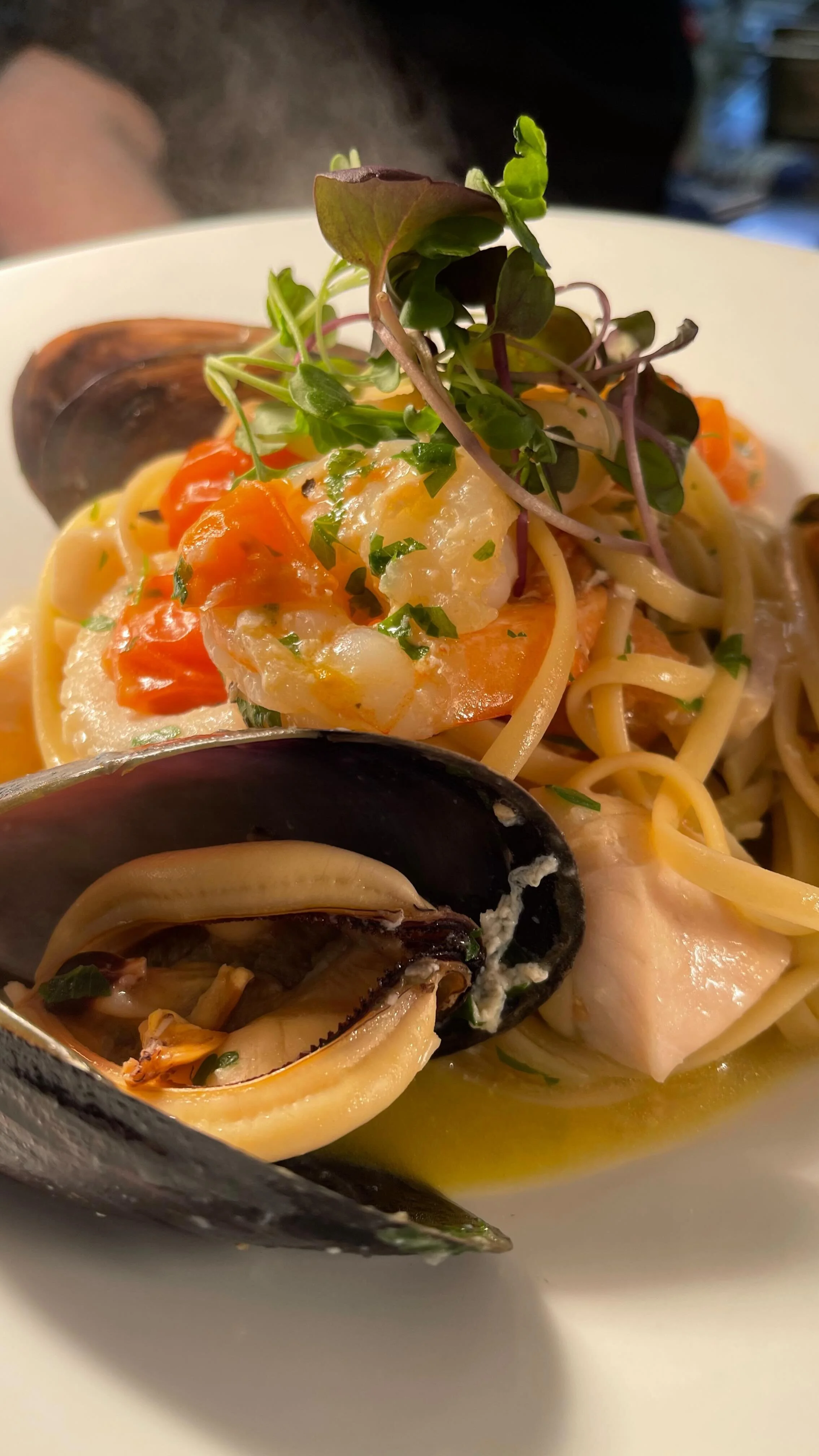 โDivine seafood linguini. Perfect al dente pasta with a lovely jus and big fresh seafood - large muscles, scallops and prawns. The chef clearly has a passion for Italian food.โ